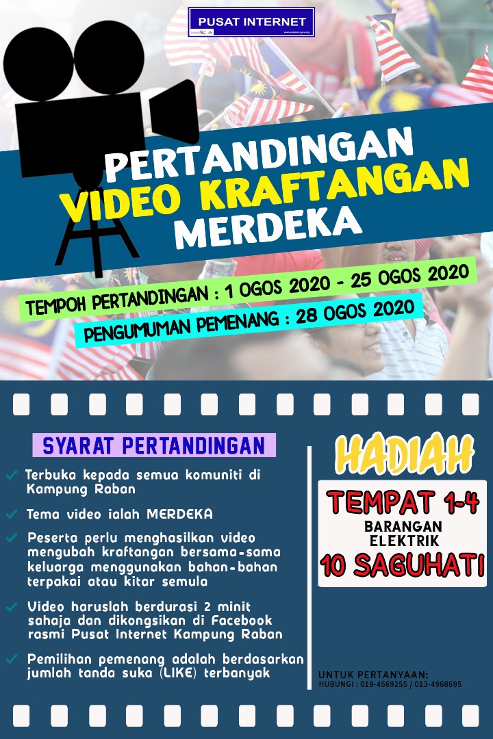 Jom beramai-ramai menyertai pertandingan ini demi menyemarakkan lagi semangat kemerdekaan dan cintakan negara. Hantarkan video anda ke Facebook rasmi kami Pusat Internet Kg. Raban. Like terbanyak berpeluang mendapat hadiah menarik.